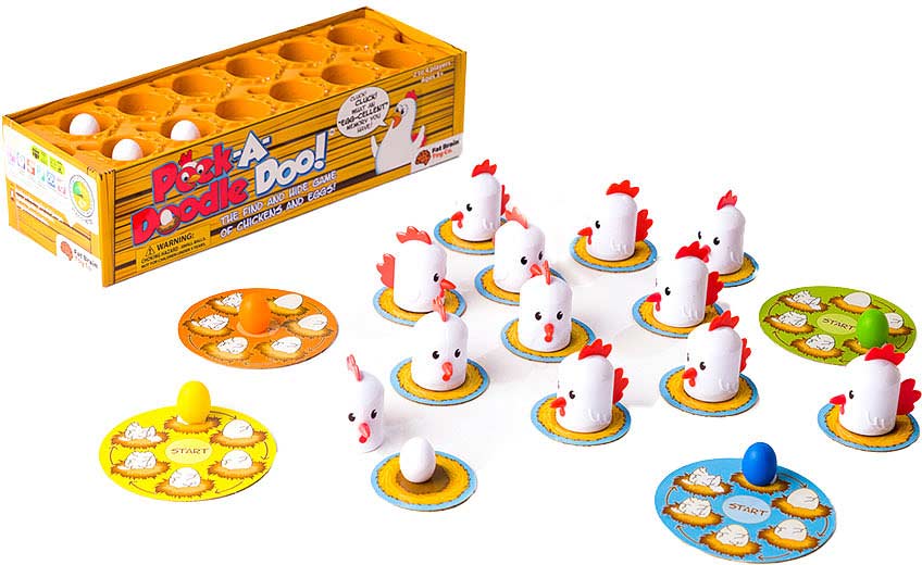 The find and hide game of chickens and eggs! Cluck! Cluck! What an "egg-cellent" memory you have! A "My First Game" for your clever little farmer. With constant motion, Peek-A-Doodle Doo engages your child's memory and concentration in a farm fresh way! Part 1: Cluck! Find the Eggs! Can you rule the roost? Collect all twelve eggs and return them to the crate. Choose carefully little farmer. Keep an eye on your fellow players and where they are moving their chickens. Part 2: Cluck, Cluck! Hide the Eggs! Next, players take turns removing an egg from the egg crate, placing it on an empty nest, and then moving a chicken to cover the egg. Play continues until all 12 eggs are covered by chickens. Scoring (No fowl play...) One wrong move could ruffle your feathers... If a player selects an incorrect chicken, they move their colored egg to the next cracked egg in their scoring nest's cracking egg progression. Too many moves and CRACK! You're out of CLUCK! The winning player is the one with the most complete eggshell in their scoring nest when all the eggs are covered. Off you go, little farmers! Fidgety chickens are wondering who'll rule the roost... Peek-A-Doodle Doo A charming and delightful "My First Game" for children Improve concentration and memory skills Fast-moving fun; game pieces are in constant motion! First, use memory to collect all 12 eggs and return them to the crate Then, use memory to cover all 12 eggs by chickens Free range chickens feature fun rubbery beaks, combs and tails Components of silicone rubber, plastic, reinforced printed cardboard 15 Nests, 12 Chickens, 12 White Eggs, 4 Scoring Eggs-Red, Yellow, Blue, Orange, 4 Scoring Nests Fully safety tested Game Rules Included Guaranteed fun