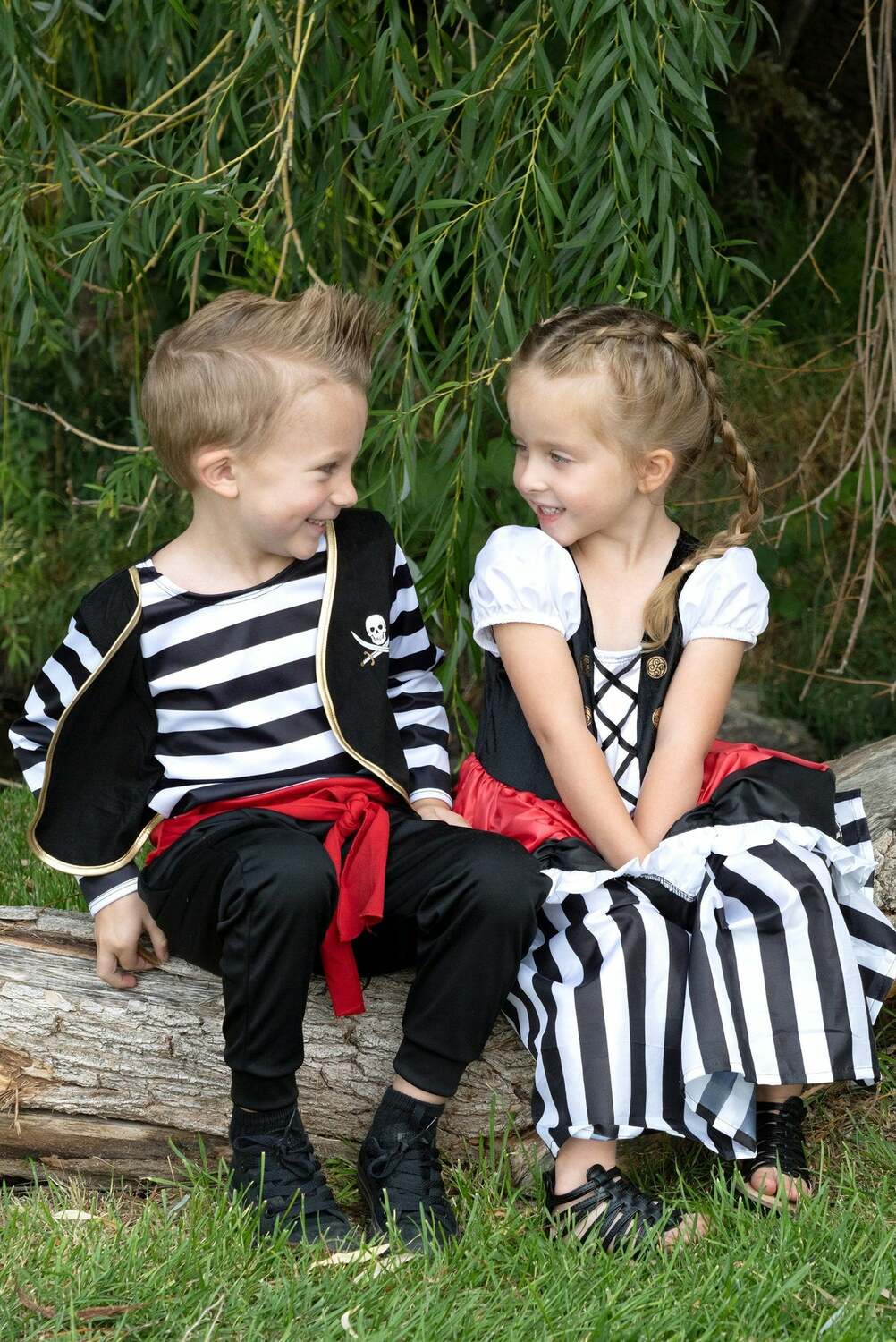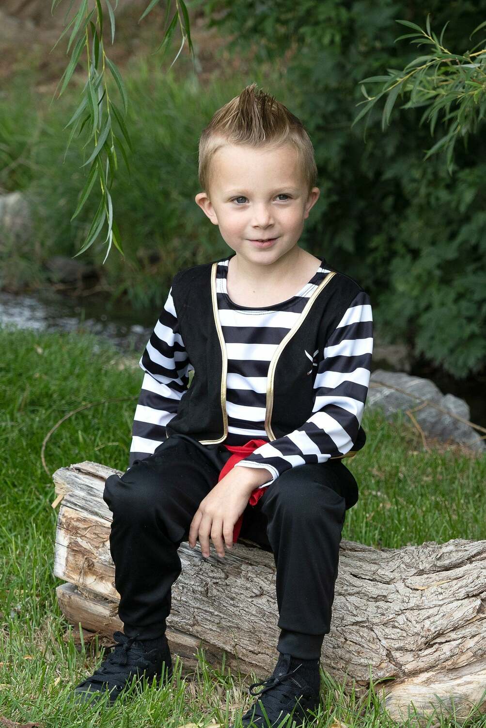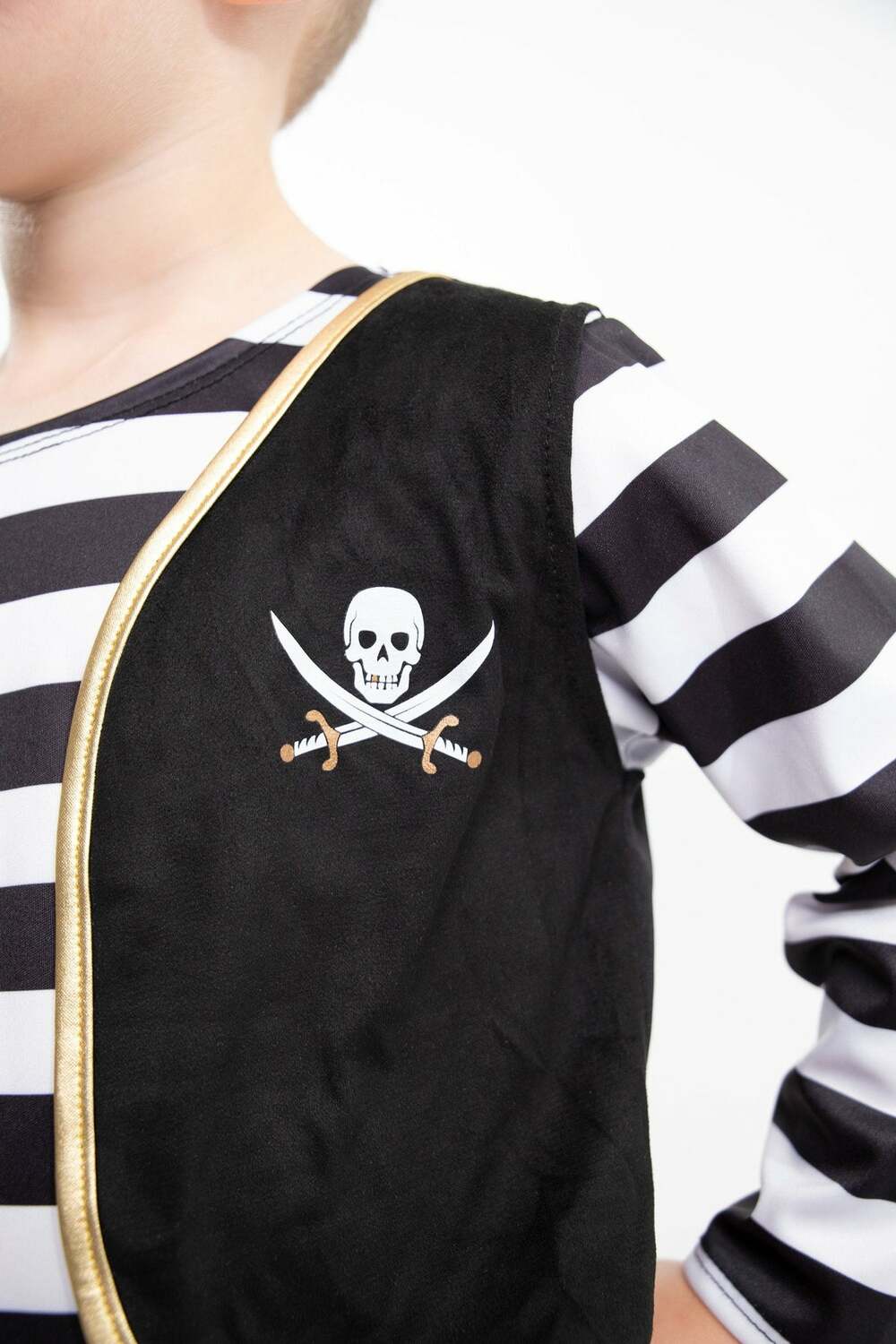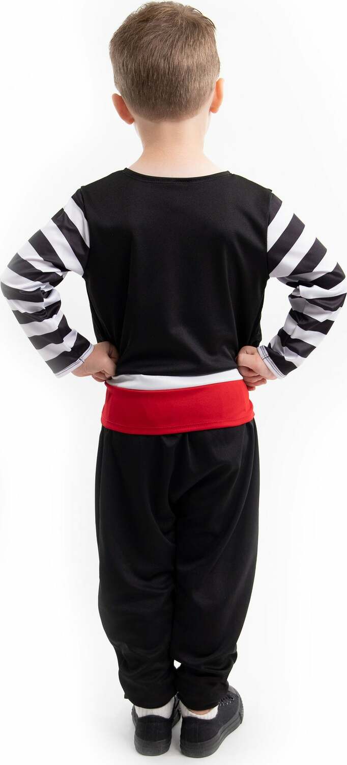 This classic set will have your little pillagers ready for playtime plunder as they transport themselves to the magical seafaring world of pirates in their new Pirate Captain set! This adventurous set comes with one-piece striped shirt with a sewn on vest embellished with skull & crossbones. The cuffed sleeves are flared at the end and the center of the top comes with a fancy red dress shirt fit for a true captain of the seas.
