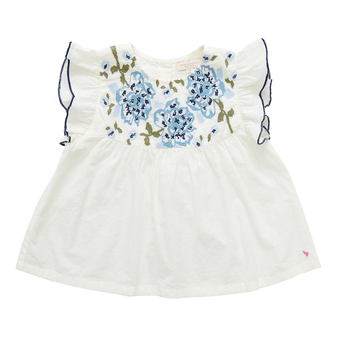 New for Spring! Our of the moment Girls Kari Top in Multi Blue Embroidery features a boho chic embroidered floral detail at the chest that really speaks to our Pink Chicken vintage vibes. A blue thread detail at the fluttery scalloped ruffle sleeve adds a feminine touch. Our signature glitter button closure at the back rounds out the look. Pairs perfectly with our Girls Theodore Short in chambray.